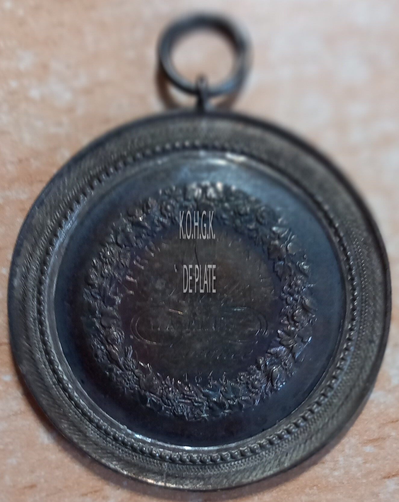 De gedenkpenning is rond in een vatting met gladde geprofileerde parelrand, en is als volgt ingegraveerd:
