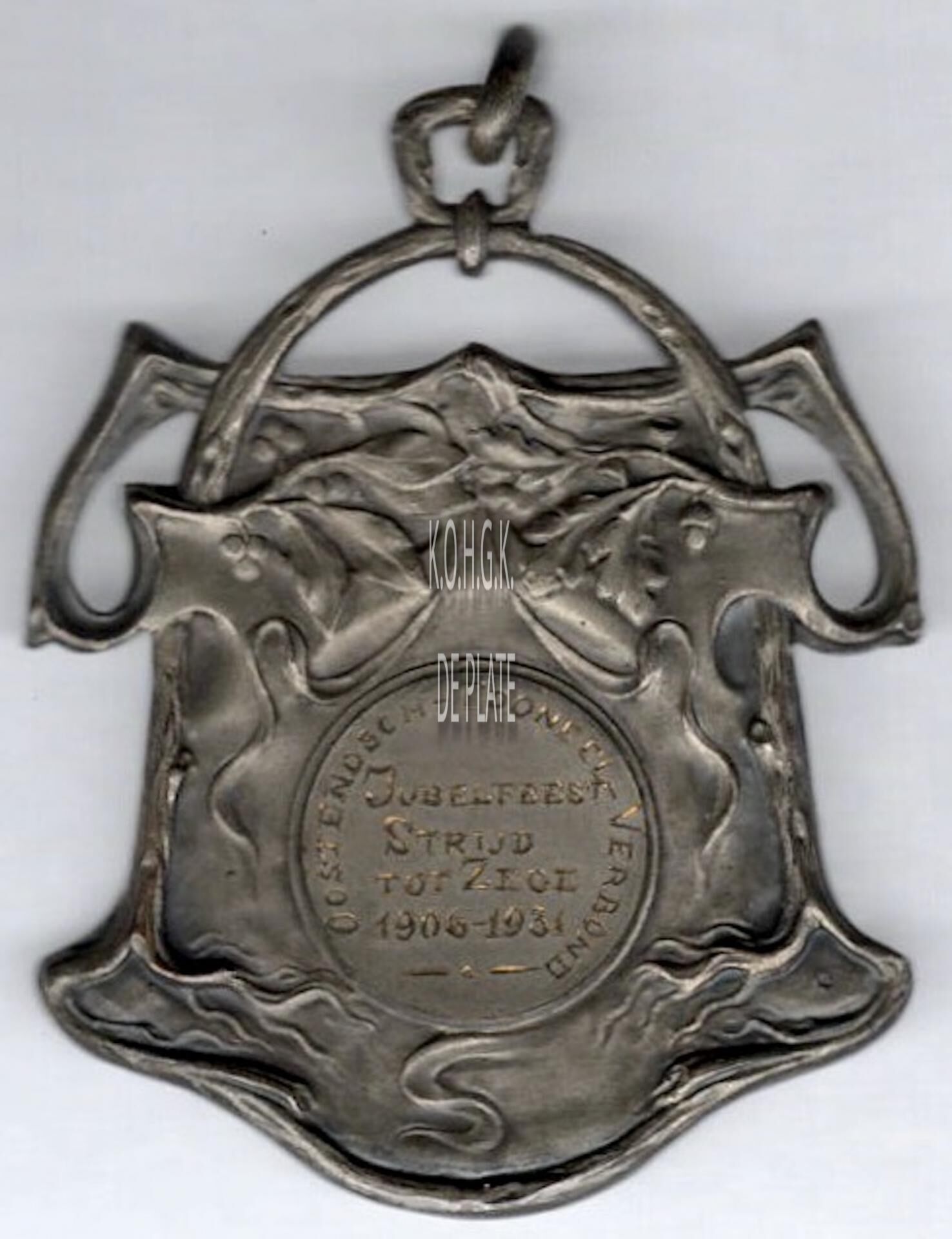 Op de keerzijde : in bas-reliëfs boven links een neerhangende lauriertak, boven rechts een neerhangende eikentak, in een binnencirkel OOSTENDSCH – TOONEEL VERBOND, horizontaal JUBELFEEST / STRIJD / TOT ZEGE / 1906-1931 / — • —