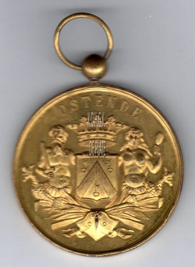 Op de voorzijde : rondom boven OSTENDE, centraal het gekroonde wapenschild met keper en drie sleutels van de stad Oostende, geflankeerd door twee schildhouders, links meerman met zwaard naar links kijkend, rechts meermin met handspiegel naar rechts kijkend, geplaatst boven een boeg op zee en gevuld met palmbladeren en twee gekruiste roeispanen