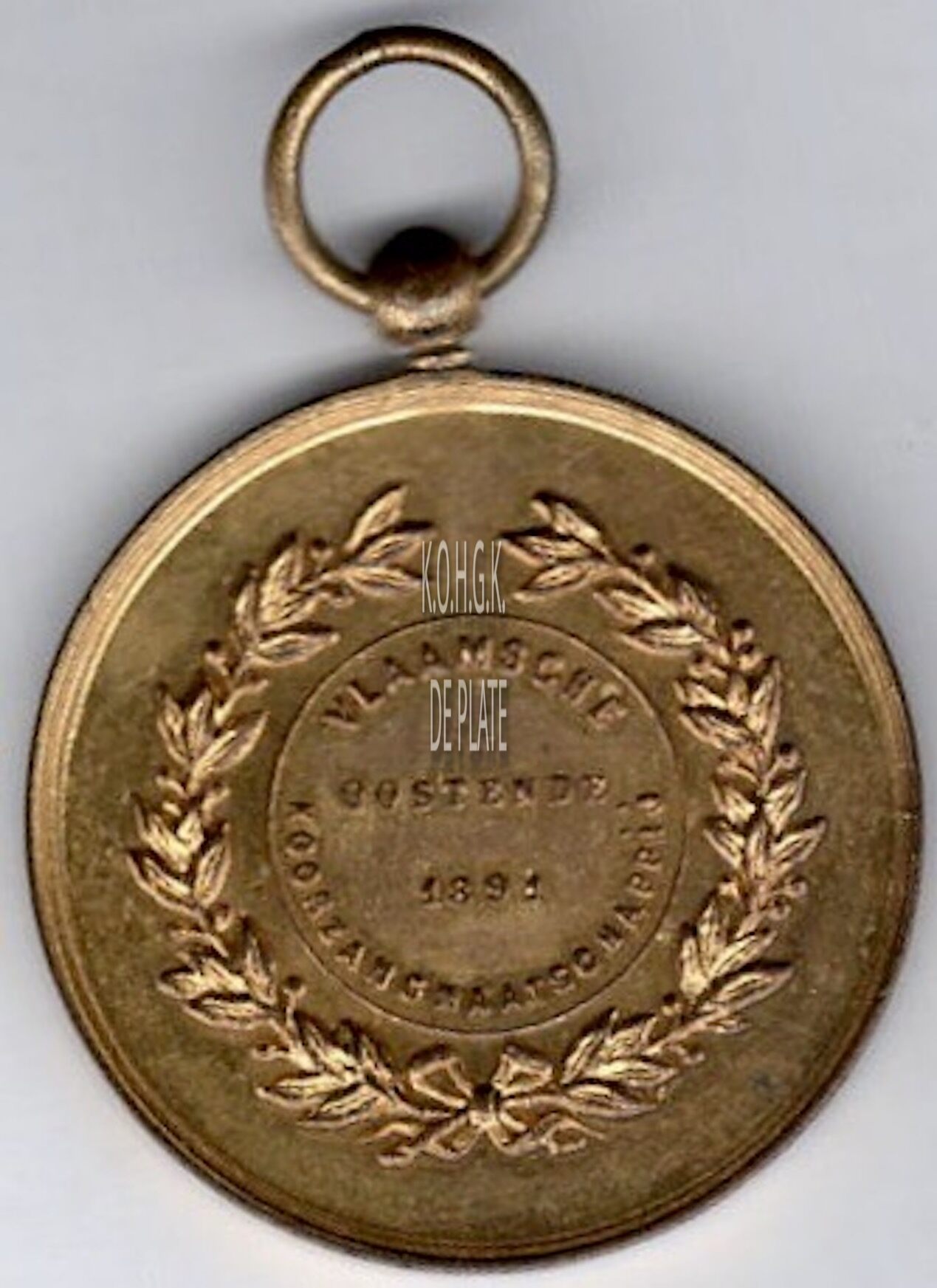 Op de keerzijde : rondom twee lauriertakken onderaan samen gestrikt met lint, centraal in een binnenring rondom VLAAMSCHE KOORZANGMAATSCHAPPIJ, horizontaal OOSTENDE / 1891