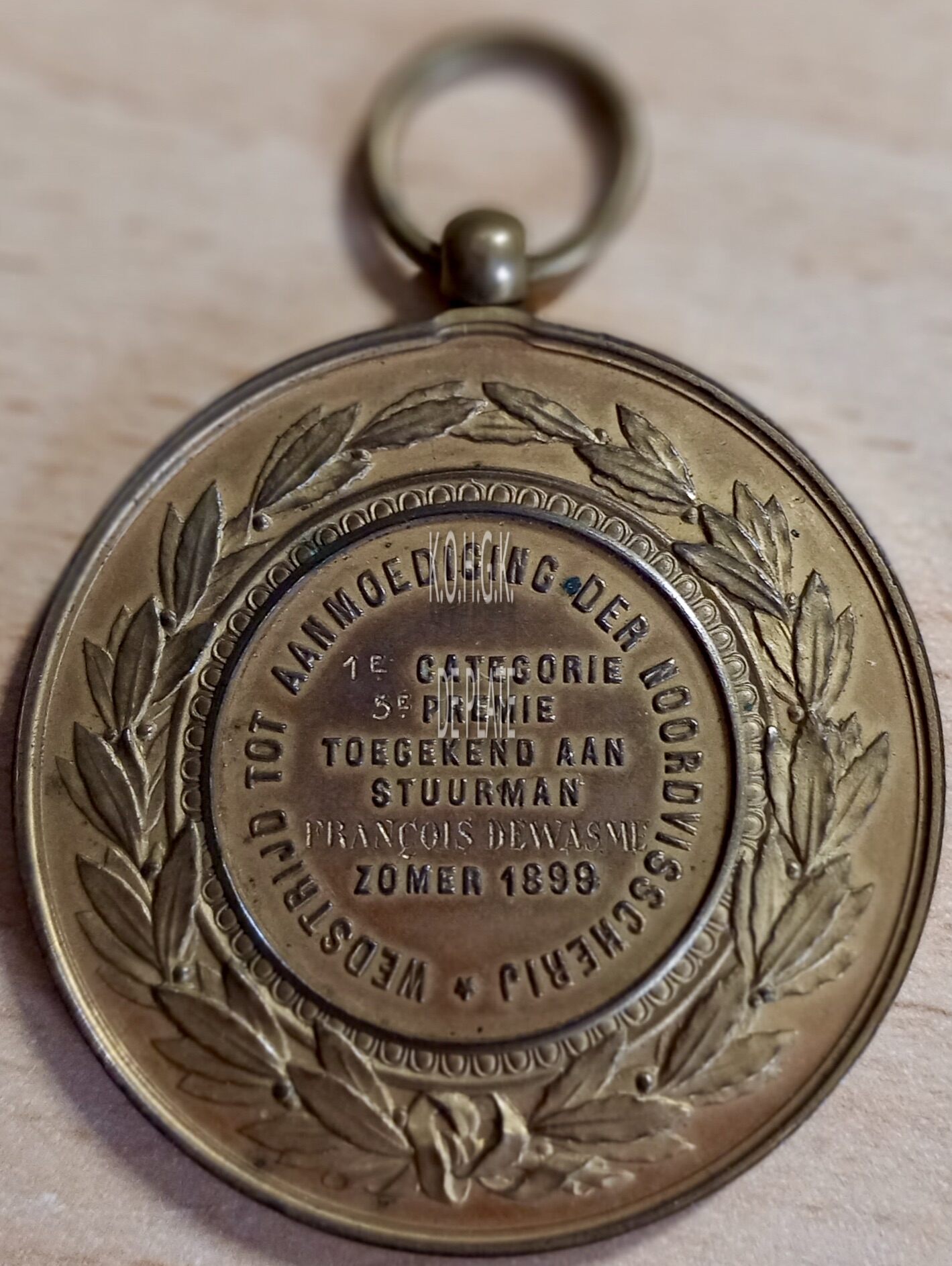 Op de keerzijde : rondom 2 lauriertakken onderaan samengestrikt, in een binnencirkel omringd door een parelrand rondom WEDSTRIJD TOT AANMOEDIGING DER NOORDVISSCHERIJ ★, centraal horizontaal 1E CATEGORIE / 5E PREMIE / GOEDGEKEURD AAN / STUURMAN / FRANCOIS DEWASME / ZOMER 1899