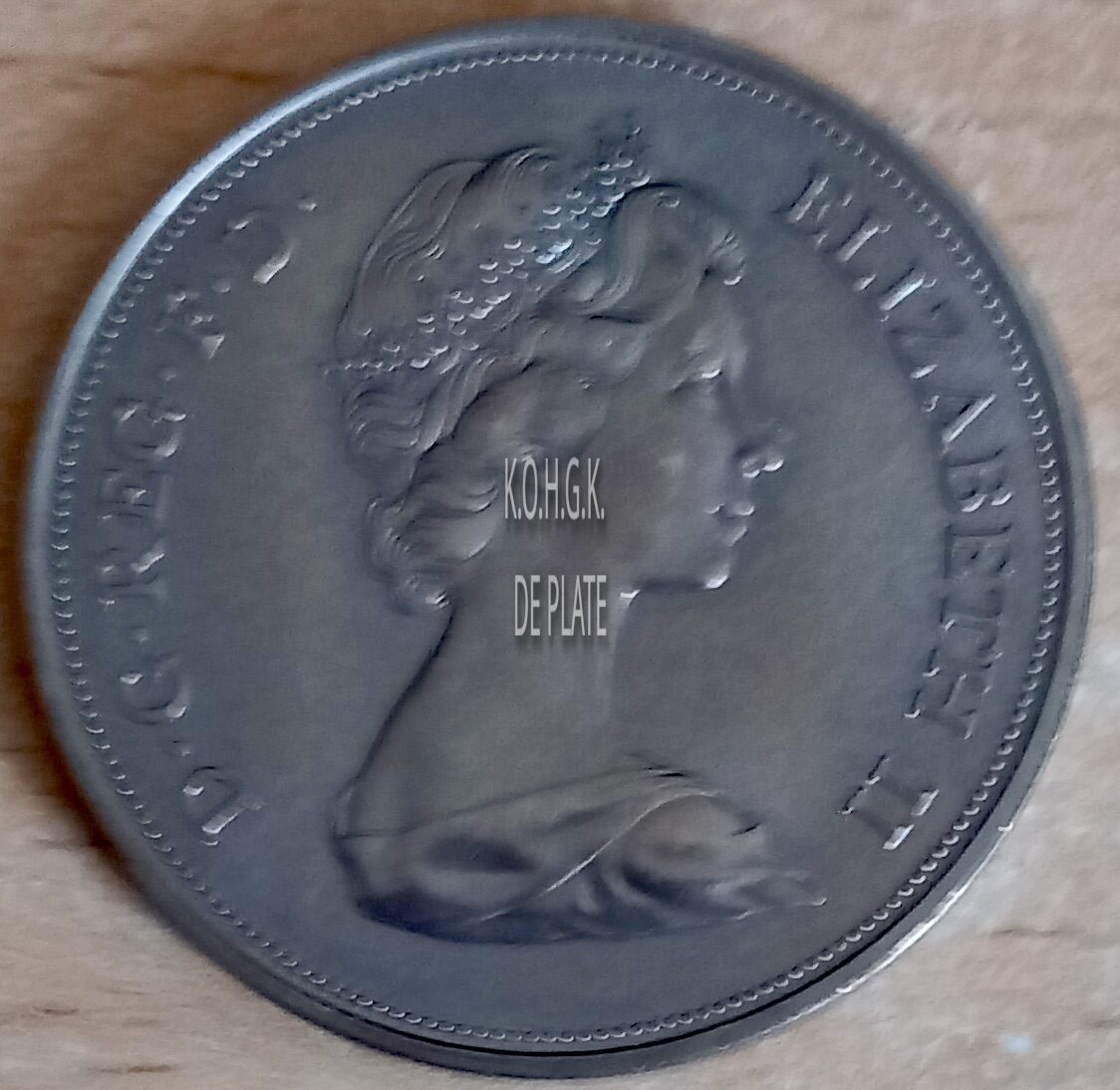 Op de voorzijde : tegen de buitenrand rondom een parelrand, rondom links D. G. REG. F. D., rondom rechts ELIZABETH II, centraal de buste van de koningin naar rechts gericht