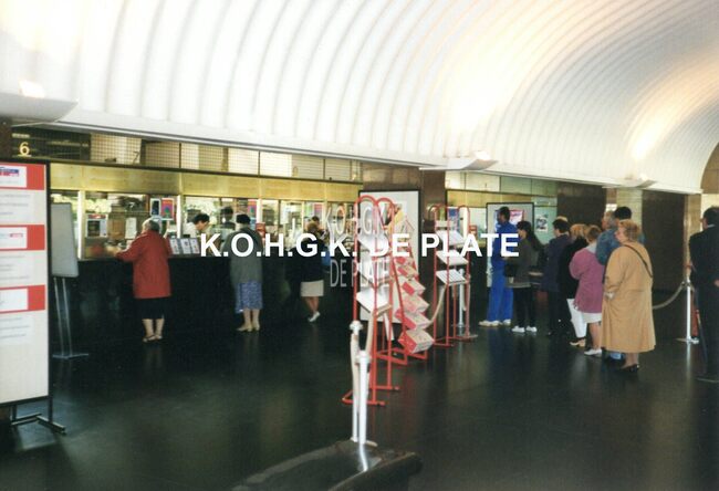 Formaat : 10 x 15 cm. - De lokettenzaal van de vroegere grote post met de mooie wandkeramiek van Jo Maes. Het stelt de vroegere postbedeling voor.
