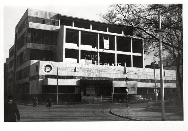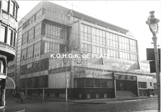 Formaat : 13 x 18 cm. - De voorgevel van het postgebouw aan de Hendrik Serruyslaan. Links, de Wittenonnenstraat. Gebouwd naar de plannen van Gaston Eysselinck.