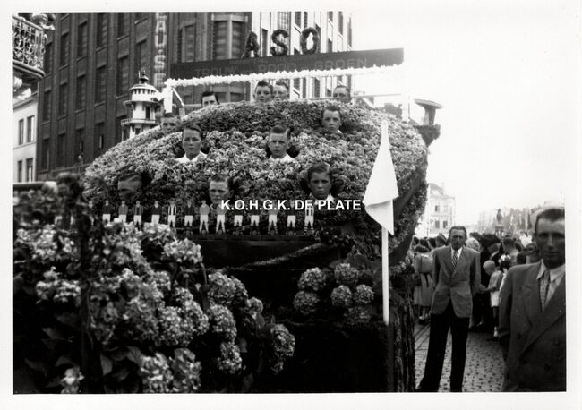 Leerlingen van het Koninklijk Werk IBIS rond de praalwagen "Car-Ferry" van het Zeewezen in de bloemencorso van 1950 op het Wapenplein.