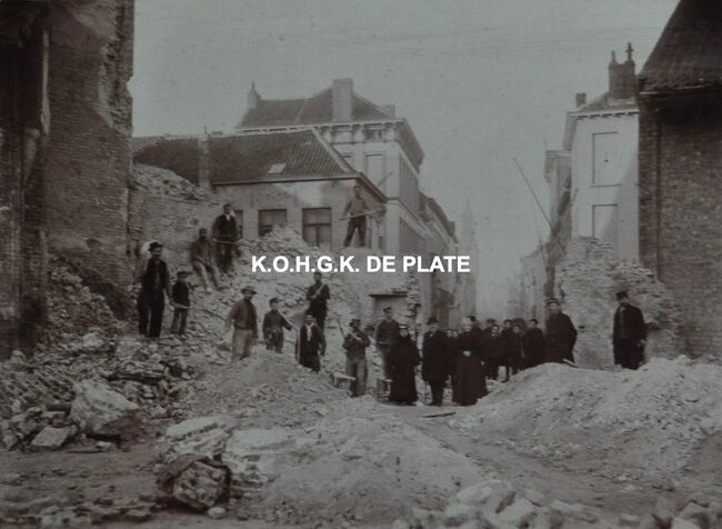 ingekaderd AFMETINGEN INTERN : 17 x 23 cm AFMETINGEN EXTERN : 34 x 40 cm Onder foto : Travaux de démolitions des ruines de l’église de SS Pierre et Paul