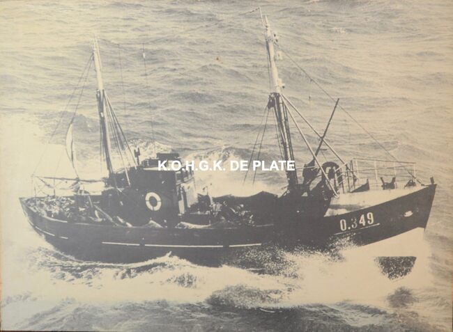 Foto van het Schuildok, nu Montgommerydok, met op de achtergrond de Visserskaai ter hoogte van de Sint-Paulusstraat en op de links de garnaalmijn. Op de voorgrond een drietal vissersschepen. ingekaderd…