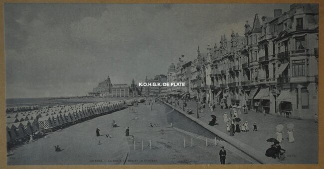 Oostende in de Belle Epoque. De Zeedijk, met links, het Groot Strand en de traditionele badkarren. Rechts, de grote hotels en op het einde de westgevel van het derde Kursaal OPSCHRIFTEN : Middenonder : Ostende…