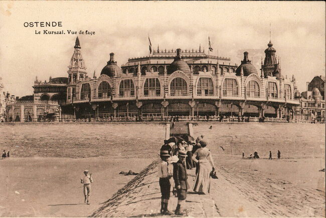 Edit. V.G.[Victor Grégoire], 42, Avenue du Midi, Bruxelles. - Ostende - Le Kursaal. Vue de façe. - De noordgevel. Het "groot strand". Wandelen op de golfbreker. Postkaartenboekje : Souvenir d'Ostende…