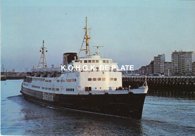 A.V.M., N° A 202. - De carferry "Princesse Marie-Christine" verlaat de haven van Oostende. Links, het Weststaketsel en de strekdam (de "Bas") en er naast het Klein Strand. Rechts, het Ooststaketsel met…