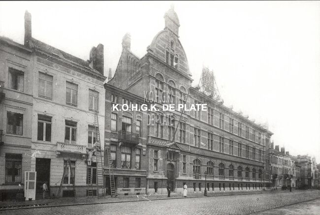 Formaat : 12 x 8 cm. - De kostschool in de Rogierlaan 10-12. - Schoolgebouw opgetrokken in 1900-1901 naar ontwerp van Joseph Caluwaers (atheneum) en Achille Raoux (kostschool); hiervoor worden enkele huizen en de Sint-…