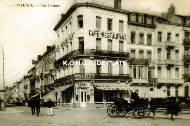 Afdruk postkaart Albert nr.201. - Formaat : 12,5 x 19 cm. - Het hotel en restaurant waren gelegen op het kruispunt van de Langestraat (rechts) en Van Iseghemlaan (links). Op het huidige Monacoplein was een…