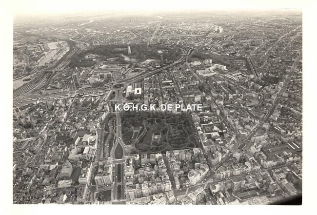 Formaat : 13 x 17,5 cm. - Luchtfoto. - Vooraan het Maria-Hendrikapark en de Velodroom. Links, de Bootsman Jonsen kazerne van de Zeemacht. Wat verder de Graaf de Smet de Naeyerlaan en aansluitend de Graaf de Smet de…