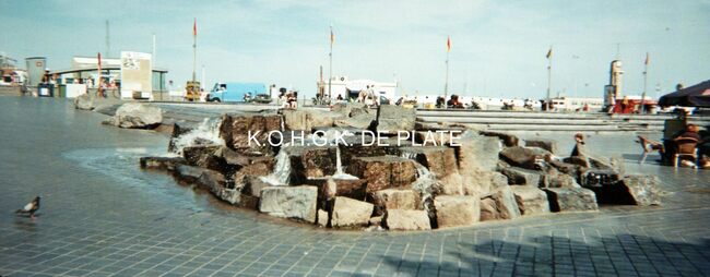 Formaat : 10 x 26 cm. - Golfbrekerfontein (kunstwerk) op het Vissersplein. In de achtergrond de Visserskaai