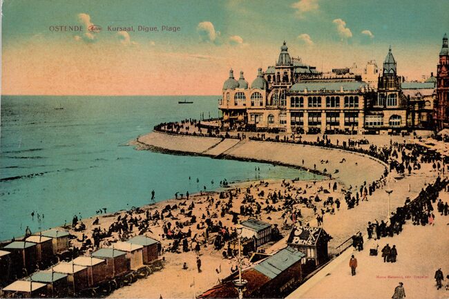 Formaat : 19 x 28 cm. - Marco, Marcovici, édit. Bruxelles. - Ostende - Kursaal, Digue, Plage. - Bijgeklerude kaart. - De westgevel van het derde Kursaal langs de Zeedijk. Strandrecreatie op het Groot Strand met de…