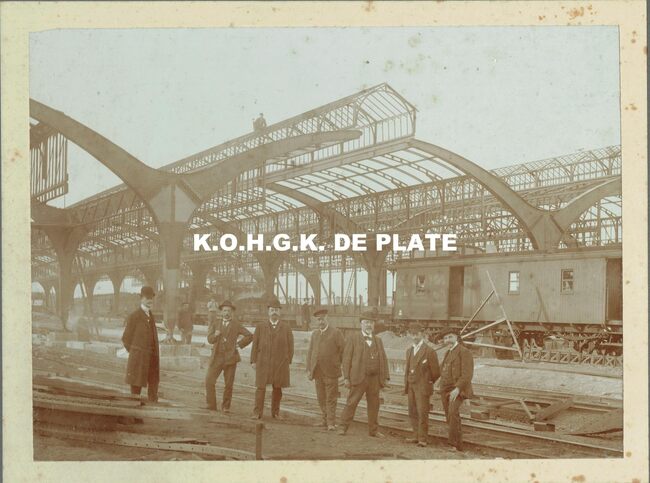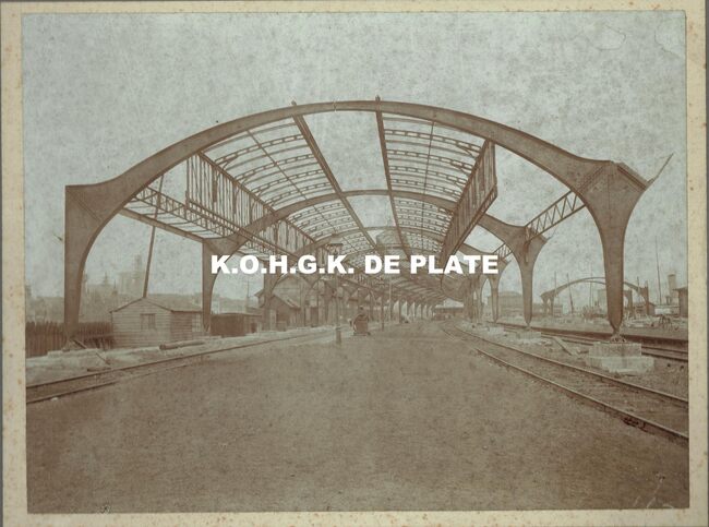Formaat : 18 x 24 cm. - Gare d'Ostende-Quai-troittoirs couverts Vue d'ensemble de la charpente de la première travée vers la ville .