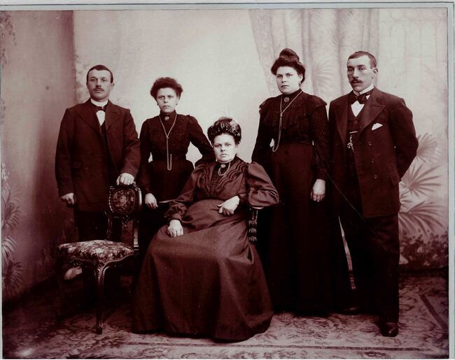 Formaat : 23 x 31 cm Vooraan in het midden mevr. Mathilde Bauts-Baer (1854-1944) V.l.n.r. Pierre Falise (1896-1954), Victorina Bauts (1876-1937), Valerie Bauts (1875-1926), Frans Lauwereins 1(878-1954)…
