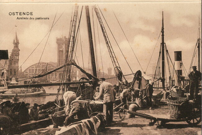 Edit. V.G.[Victor Grégoire], 42, Avenue du Midi, Bruselles. - Ostende - Arrivée des pêcheurs. - Het lossen van de bennen vis. Twee vissersvaartuigen van de rederij "Pêcheries à Vapeur". Op de achtergrond het…