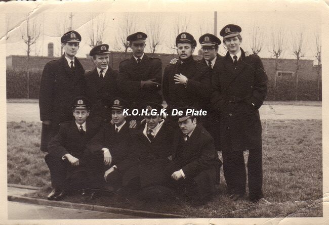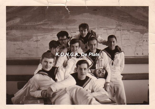 Formaat : 13 x 9 cm. - Klasfoto Zeevaartschool Oostende 1967. Foto genomen op het achterdek van het schoolschip Commandant Fourcault, gemeerd nabij de Zeevaartschool. V.l.n.r. : Moeskops Roger, Van Der Elst Juuri, Peeters…