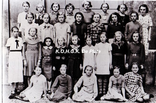 Foto 15 x 10. Klasfoto van het zesde leerjaar van de Maria-Hendrikaschool schooljaar 1937-1938. Zittend v.l.n.r. Ost Leonie - Belpaeme Marceline - Vandewalle Angèle - Westerlinck Rachel - Asseloos Marie-Louise. Op de 2de…
