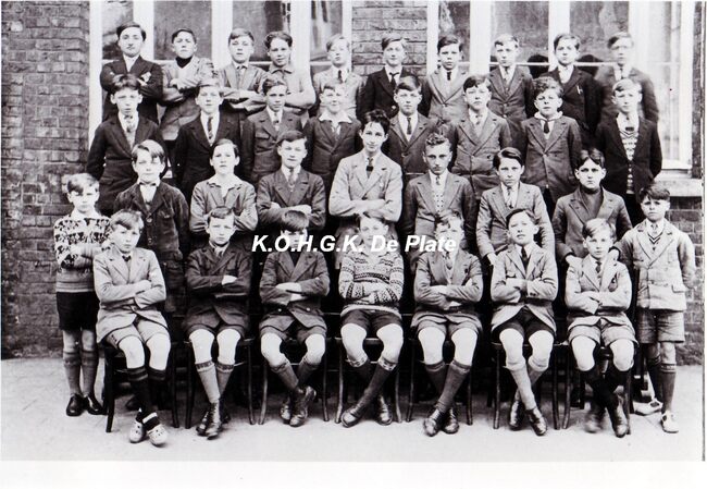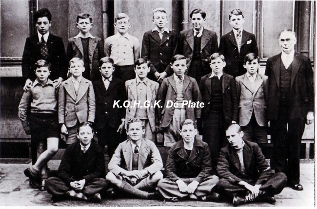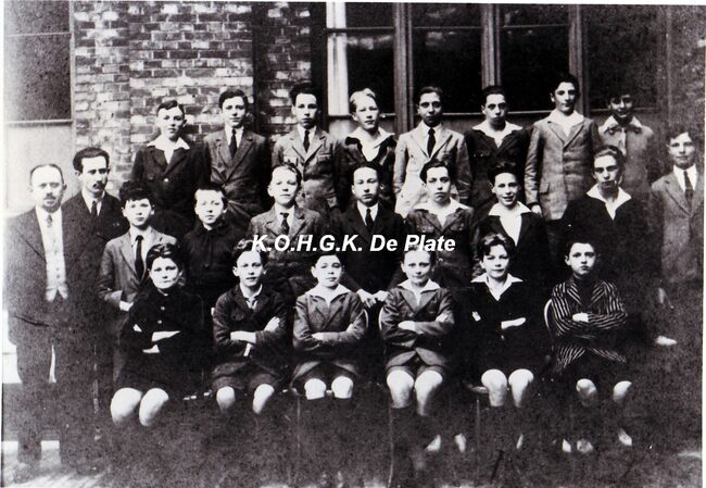 Foto 15 x 10. Zevende leerjaar van de Albertschool 1937. V.l.n.r. zittend Vandekieboom Theo - Masschalck Edgard - Bracks Gustaaf en Lingier Charles. Staand op de 2de rij Hans ?(Duitser) - Peene Fernand - Lingier - Laleman…