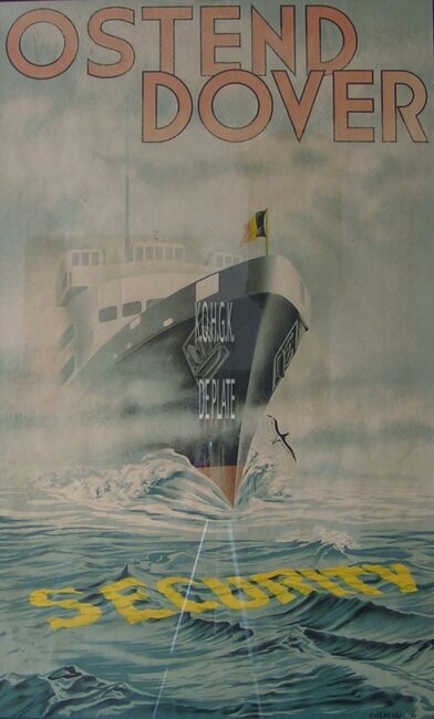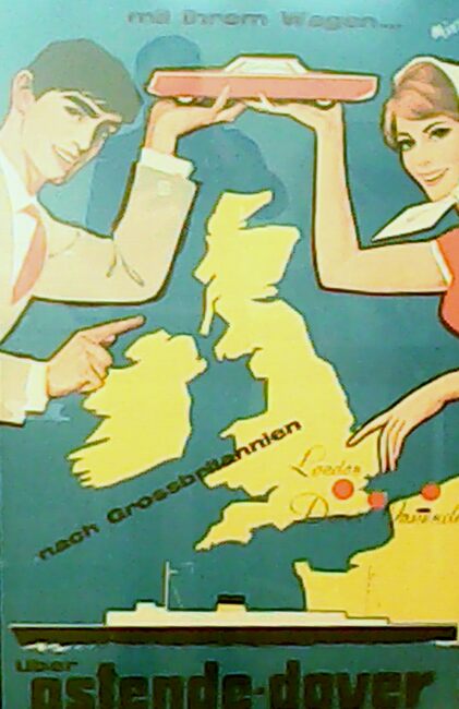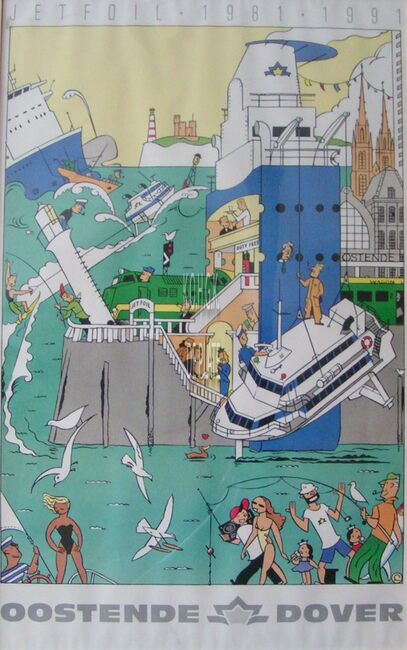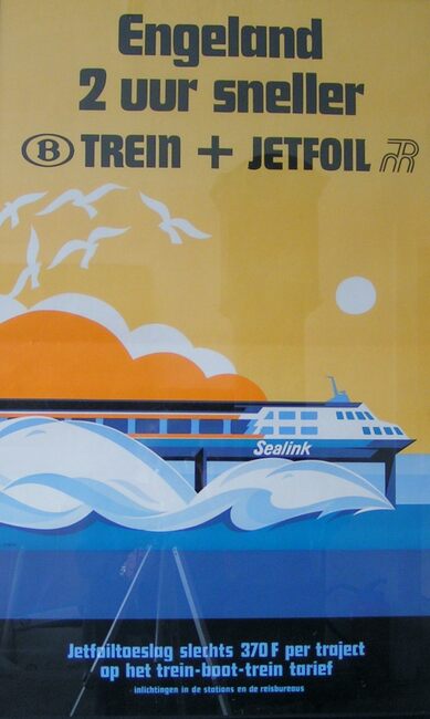 Affiche in kader, formaat : 67 x 104 cm. - Engeland 2 uur sneller trein + jetfoil Sealink. Jetfoiltoeslag slechts 370 F per traject op de trein-boot-trein tarief.