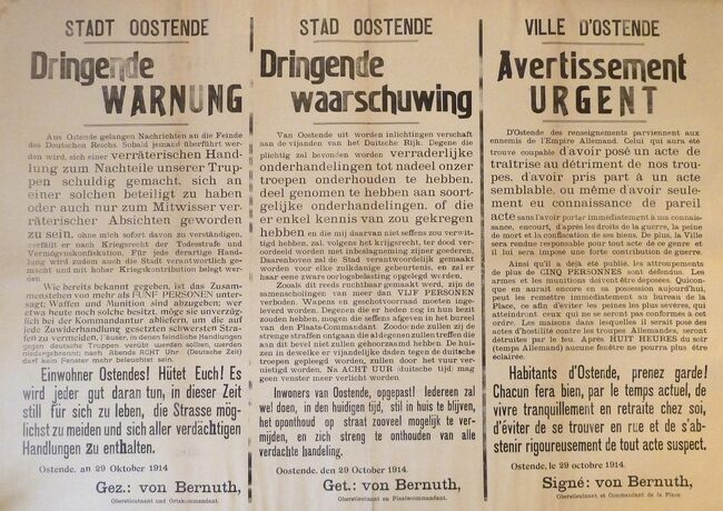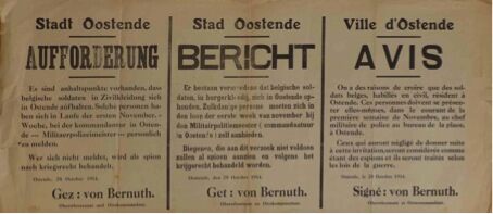 Formaat : 31 x 73 cm. Kennisgeving uitgaande van de Plaatscommandant von Bernuth betreffende de eventuele aanwezigheid van Belgische soldaten in Oostende