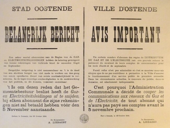 Formaat : 54 x 73 cm. Kennisgeving uitgaande van de burgemeester A.Liebaert betreffende betaling van de gas- en elektriciteitsrekeningen