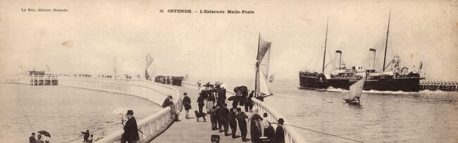 Le Bon, éditeur, Ostende, N° 30. Ostende - L'Estacade Malle-Poste. - Panoramische prentkaart. - De pakketboot "Princesse Josephine" verlaat de havengeul van Oostende. Op het Weststaketsel, vooraan, "…