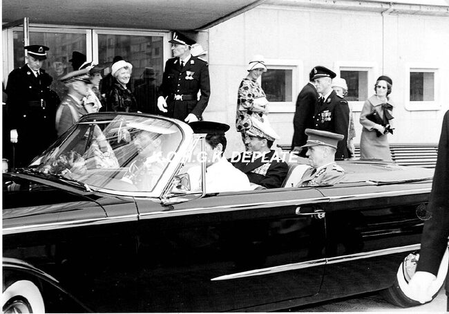 Formaat : 13 x 18 cm. - Bij het verlaten van het Kursaal werd de sjah vergast op een defilé van Oostendse folkloreverenigingen. We zien links de Oostendse reuzen Tone en Wanne. Links, de provinciegoouverneur van West-…