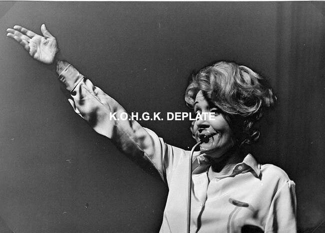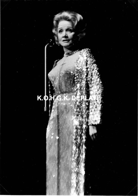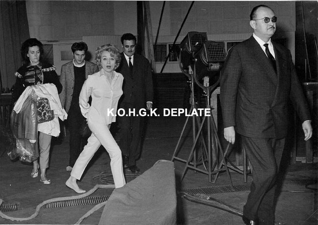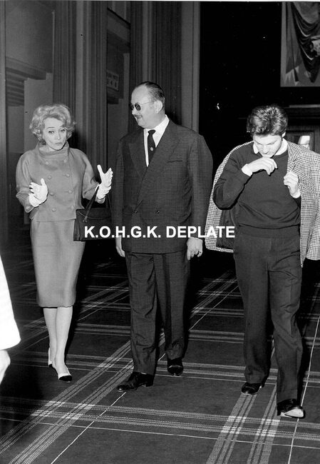 Formaat : 17 x 12 cm. - Marlene Dietrich wandelend in de erehall in het gezelschap van o.a. Roger De Ramée, directeur van de Kursaal (naast haar).