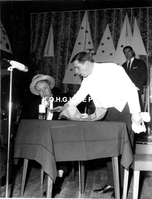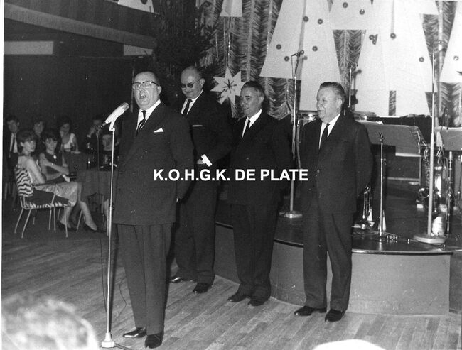 Formaat : 18 x 24 cm. - De nightclub "La Champagne". Schepen John Lauwereins houdt zijn toespraak. Van rechts naar links, de schepenen Jozef Van den Kieboom, Raymond Miroir en Roger De Ramée, directeur van de…