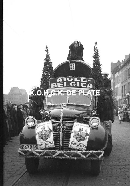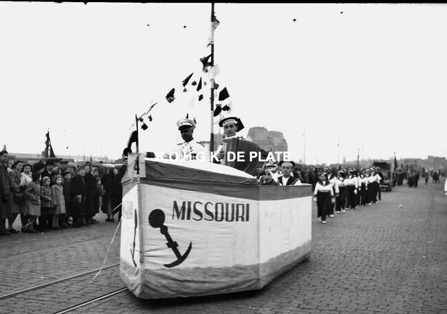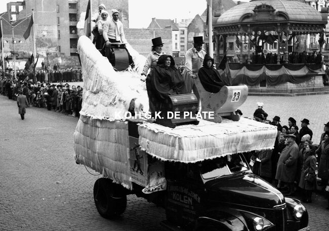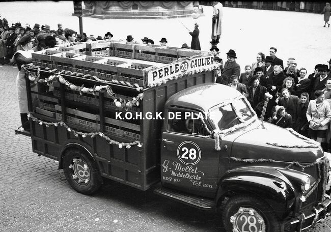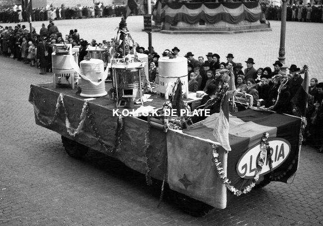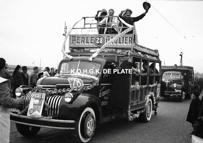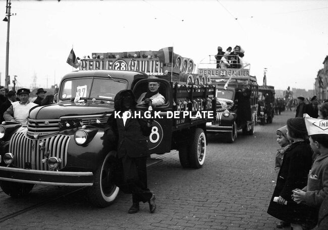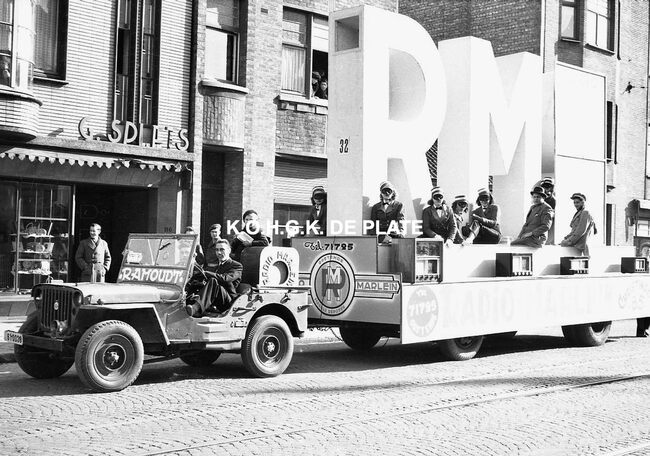 Negatief : 4 x 6,5 cm. - Praalwagen nr. 32 van "Radio Marlein" getrokken door een jeep van Ramoudt, op de Torhoutsesteenweg, nabij de bakkerij "Splets"
