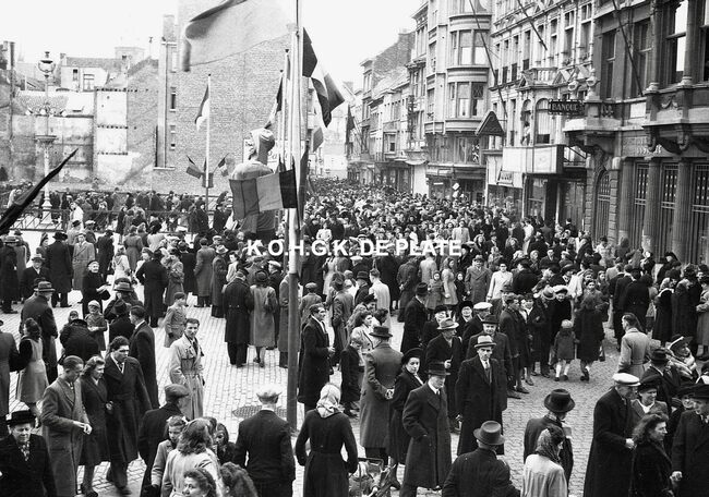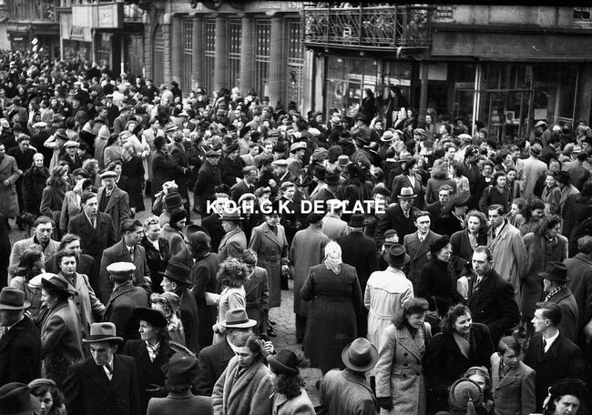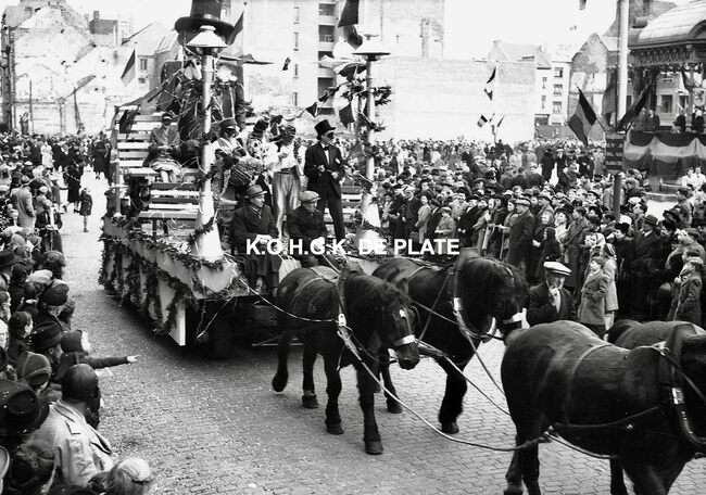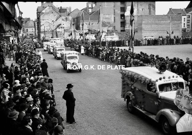 Negatief : 4 x 6,5 cm. - Veel volk op het Wapenplein naar aanleding van de halfvastenstoet. Rechts, de Adolf Buylstraat.