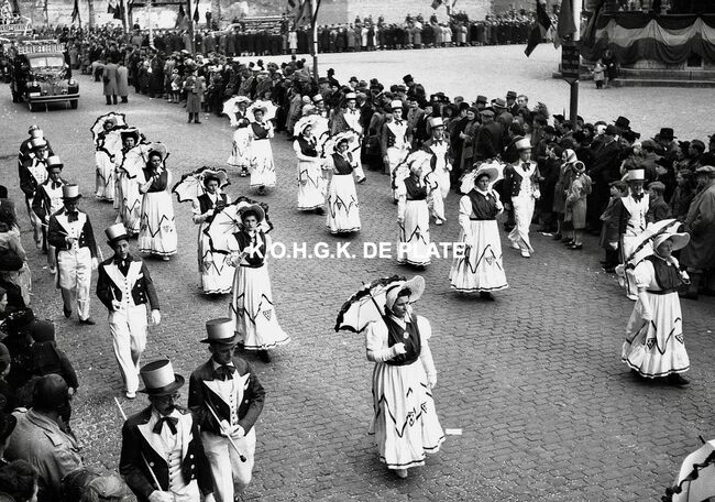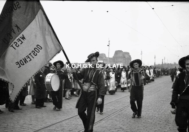 Negatief : 4 x 6,5 cm. - De leden van de folkloregroep "Het Huwelijk van Paul en Louise" van de spaarmaatschappij "Ons Vermaak" uit het café "Fientje Keters" uit Bredene, hier op de…