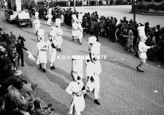 Negatief : 4 x 6,5 cm. - De carnavalgroep "De Brugse Zoo" met muziek in de Kapellestraat ter hoogte van "Hotel de Venise"