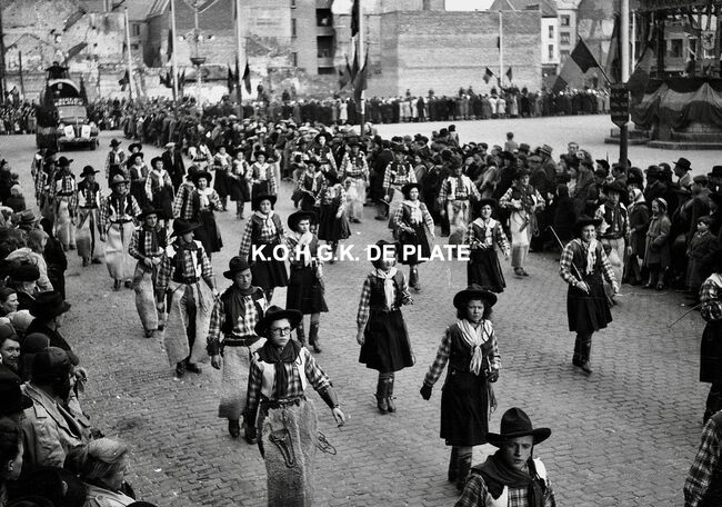 Negatief : 4 x 6,5 cm. - De folkloregroep "Het Huwelijk van Paul en Louise" uit Bredene, hier op het Wapenplein