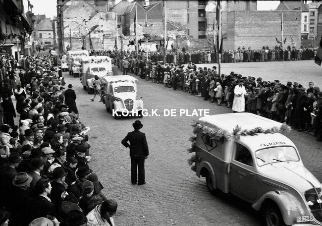 Negatief : 4 x 6,5 cm. - Auto's van de n.v. Palmafina in de publiciteitskaravaan op het Wapenplein. De firma was gevestigd, Wetstraat 4, Brussel en vervaardigde olie, margarine en zeep.