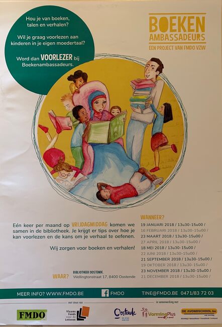 Affiche : Boekenambassadeurs. Bibliotheek Oostende, Wellingtonstraat 17. 19/01-21/12/2018