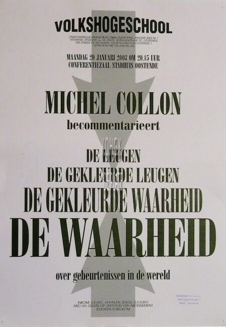 Affiche : Volkshogeschool. De leugen, de gekleurde leugen, de gekleurde leugen, de waarheid . Conferentiezaal stadhuis Oostende. 20/01/2003