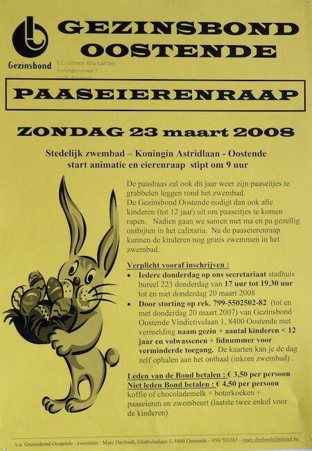 Affiche : Gezinsbond Oostende. Paaseierenraap. Stedelijk zwembad Oostende. 23/03/2008