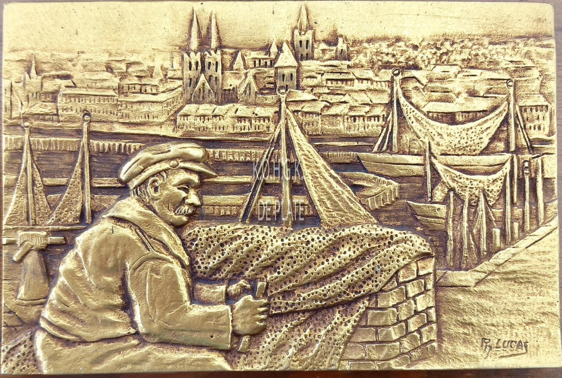 Op de voorzijde : een tafereel met op de voorgrond een visser die netten hersteld op de Oosteroever, in de achtergrond een zicht op de stad en de haven, rechtsonder gesigneerd R.LUCAS