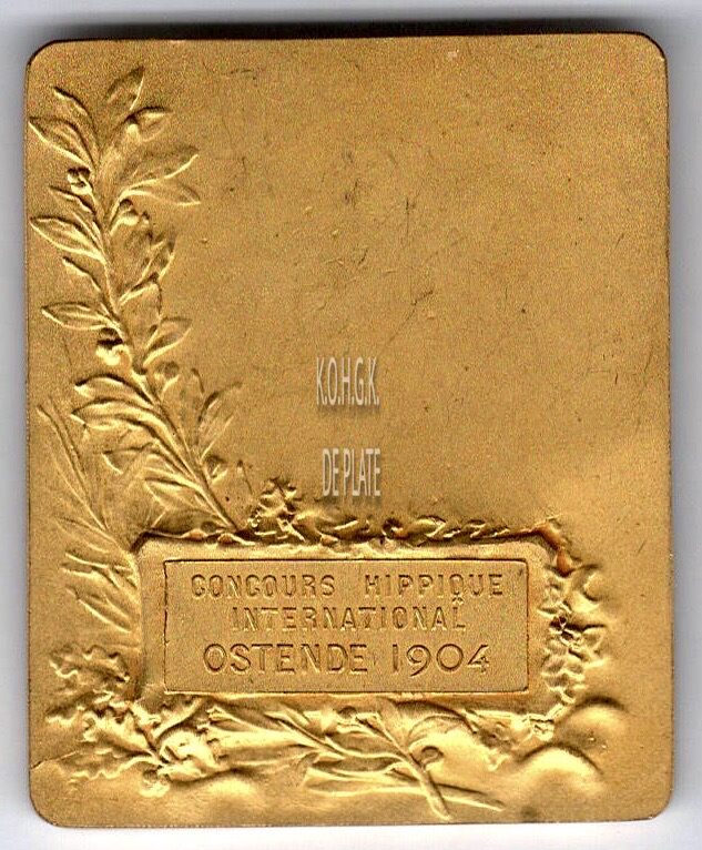 Op de keerzijde : van onder naar linksboven, plat een eikentak, naar boven toe een lauriertak, op een plaket er bovenop CONCOURS HIPPIQUE / INTERNATIONAL / OSTENDE 1904