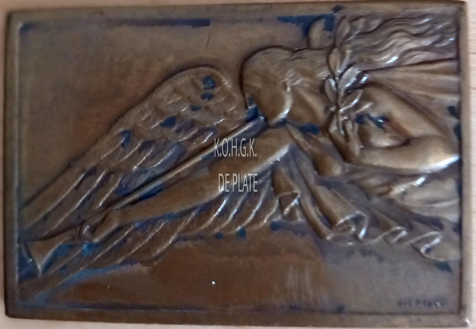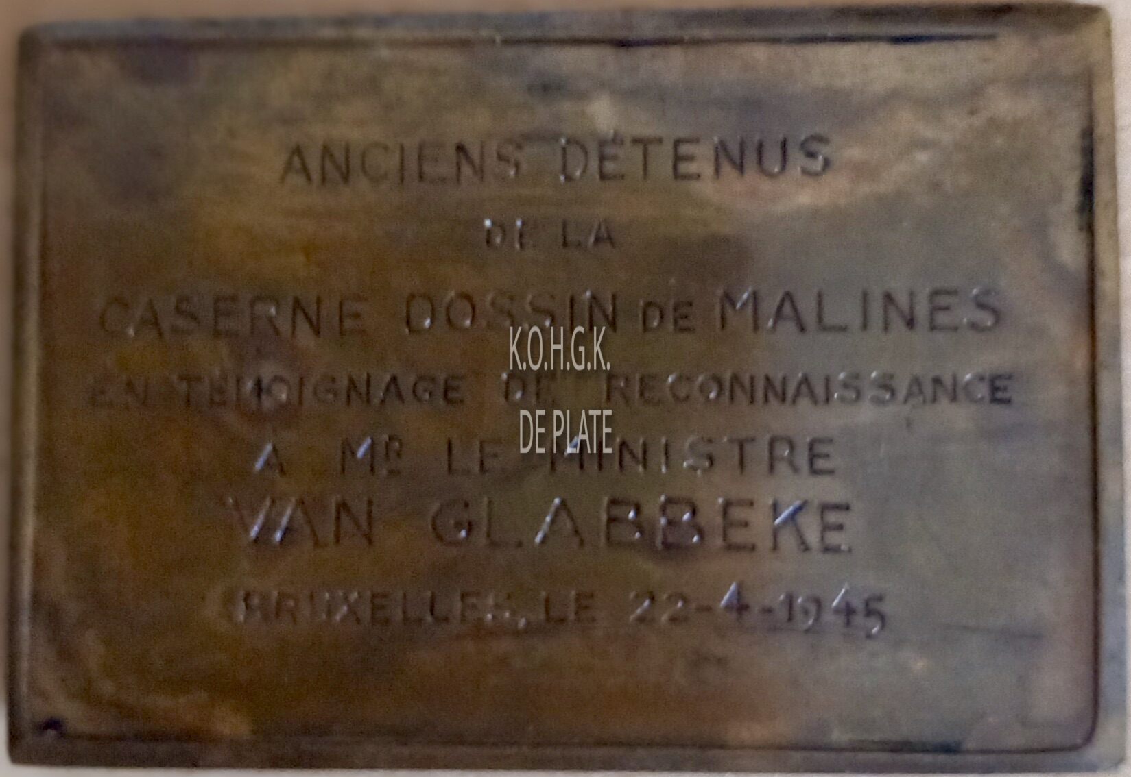 Het erkentenisplaket is rechthoekig met gladde geprofileerde rand en als volgt ingegraveerd: