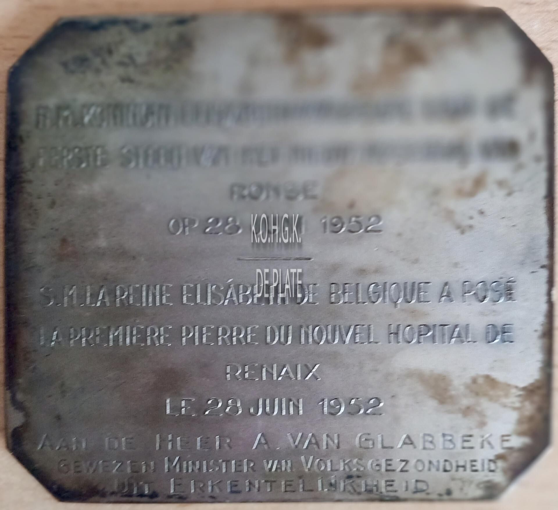Op de keerzijde : horizontaal  H.M. KONINGING ELISABETH VAN BELGIE LEGT DE / EERSTE STEEN VAN HET NIEUWE HOSPITAAL VAN / RONSE / OP 28 JUNI 1952 --------- S.M. LA REINE ELISABETH DE BELGIQUE A POSE / LA PREMIERE PIERRE DU NOUVEL HOPITAL DE / RENAIX / LE 28 JUIN 1952 / AAN DE HEER A. VAN GLABBEKE / GEWEZEN MINISTER VAN VOLKSGEZONDHEID / UIT ERKENTELIJKHEID