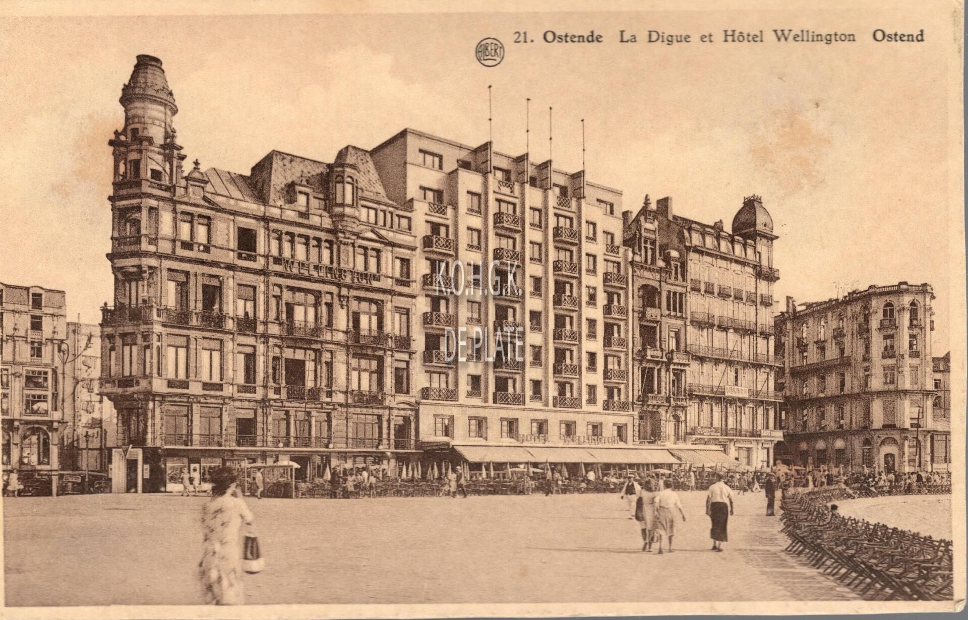 Albert, N° 21. - Ostende - La Digue et Hôtel Wellington. Ostend. Het Hotel Wellington gezien vanaf "Petit Nice" langs de Albert I-promenade. Zicht van na de Tweede Wereldoorlog, want de oorlogsschade is nog zichtbaar.
