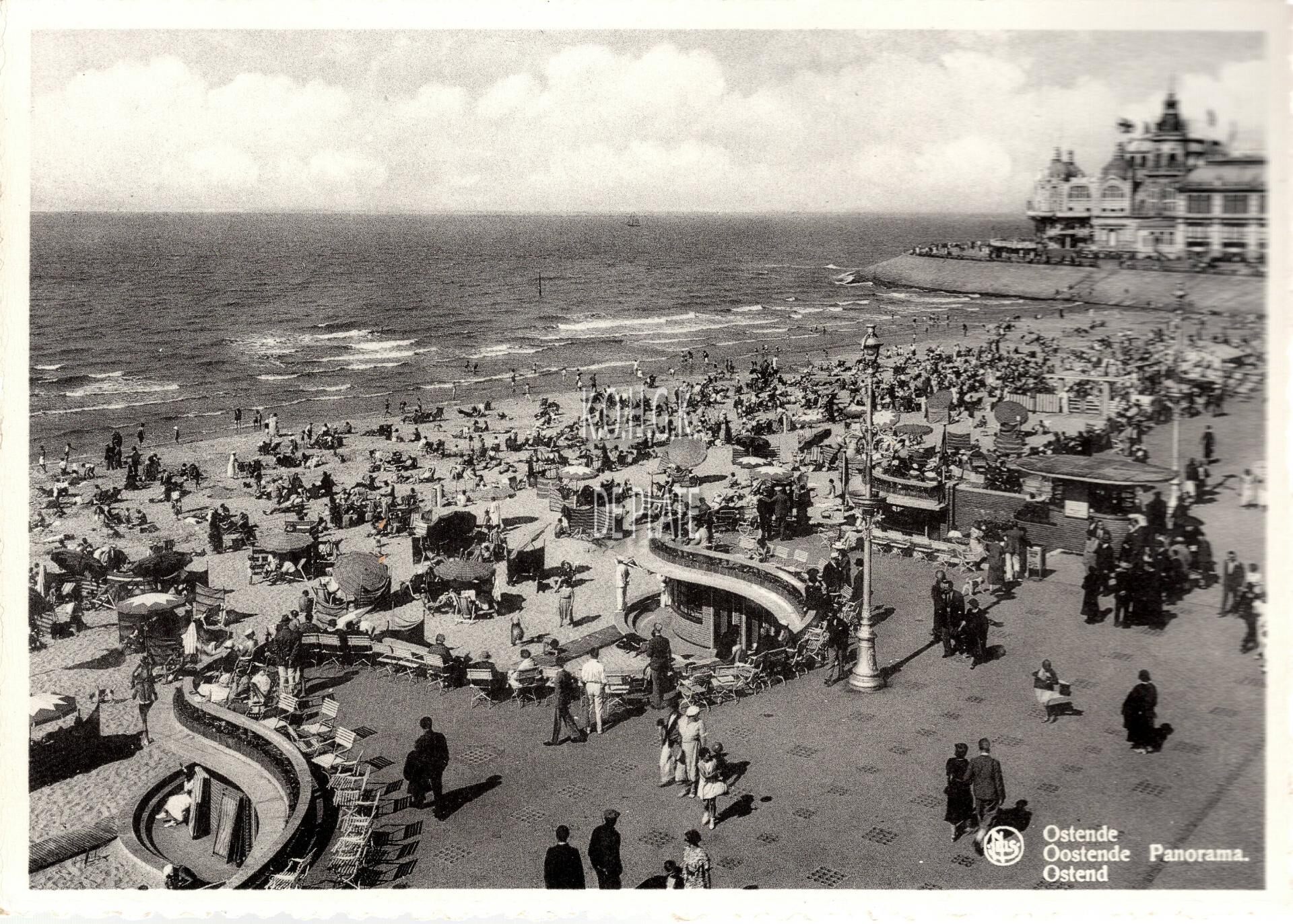 Formaat : 10,5 x 15 cm. - Nels "Bromurite. - Ostende, Oostende, Ostend - Panorama. - De Albert-promenade met links de badinstallaties, het "groot strand" en detail van de westgevel van het derde Kursaal.