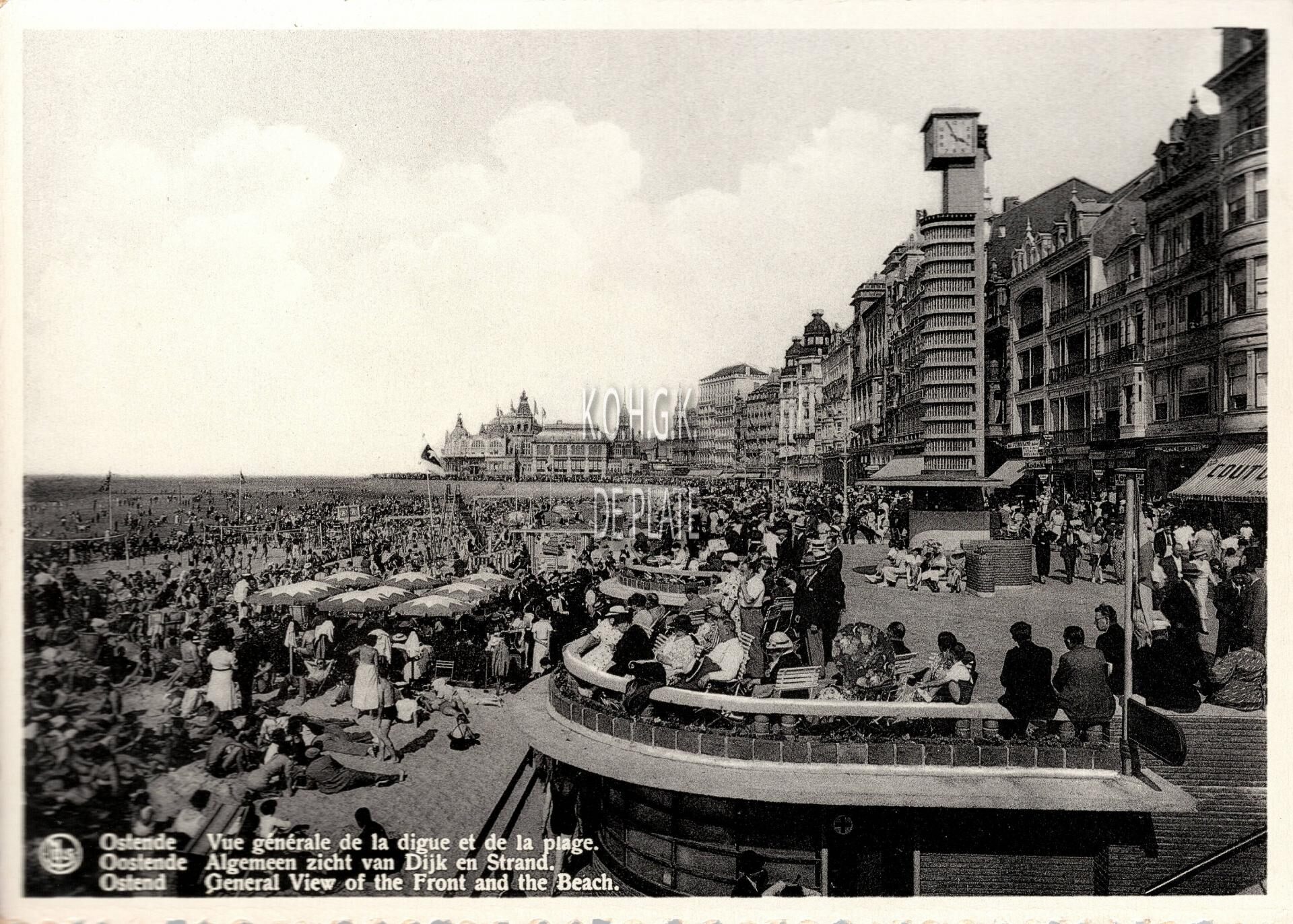 Formaat : 10, 5 x 15 cm. - Nels. "Bromurite". - Ostende - Vue générale de la digue et de la plage. Oostende - Algemeen zicht van Dijk en Strand. Ostende - General View of the Front an d the Beach. - Veel volk op een zonnige namiddag. Genieten van de gezonde zeelucht, hier op de Albert I-promenade nabij de badinstallaties. Rechts de villa's en grote hotels met op het einde de westgevel van het derde kursaal.