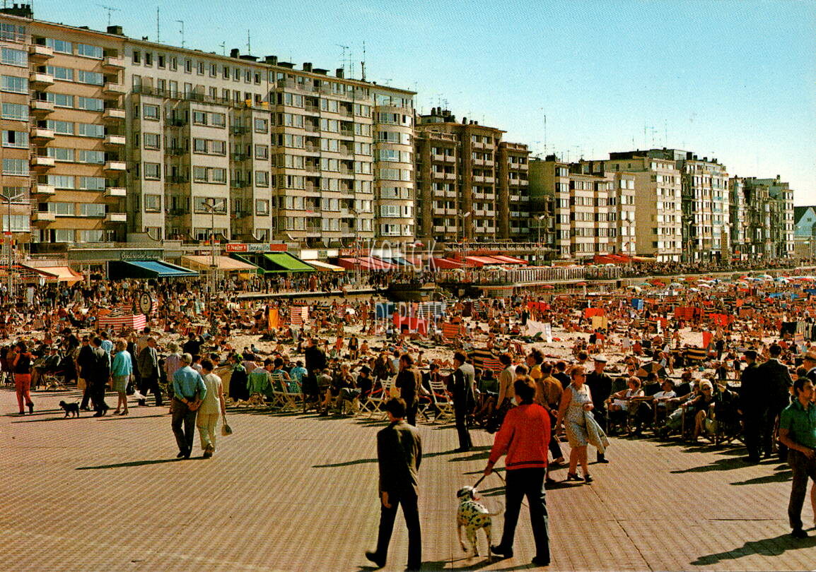Cromo, N° 101/1. - Oostende - Strand en wandelterras. - De Albert I-promenade, gezien vanaf "Petit Nice", richting de Koninklijke Villa. Rechts, het Groot Strand. "Petit Nice" is het plekje van de Albert I-promenade nabij de westgevel van de Kursaal, waar het heerlijk zitten is, wanneer bij zonnig weer toch een frisse, soms koude noord-oostenwind waait.