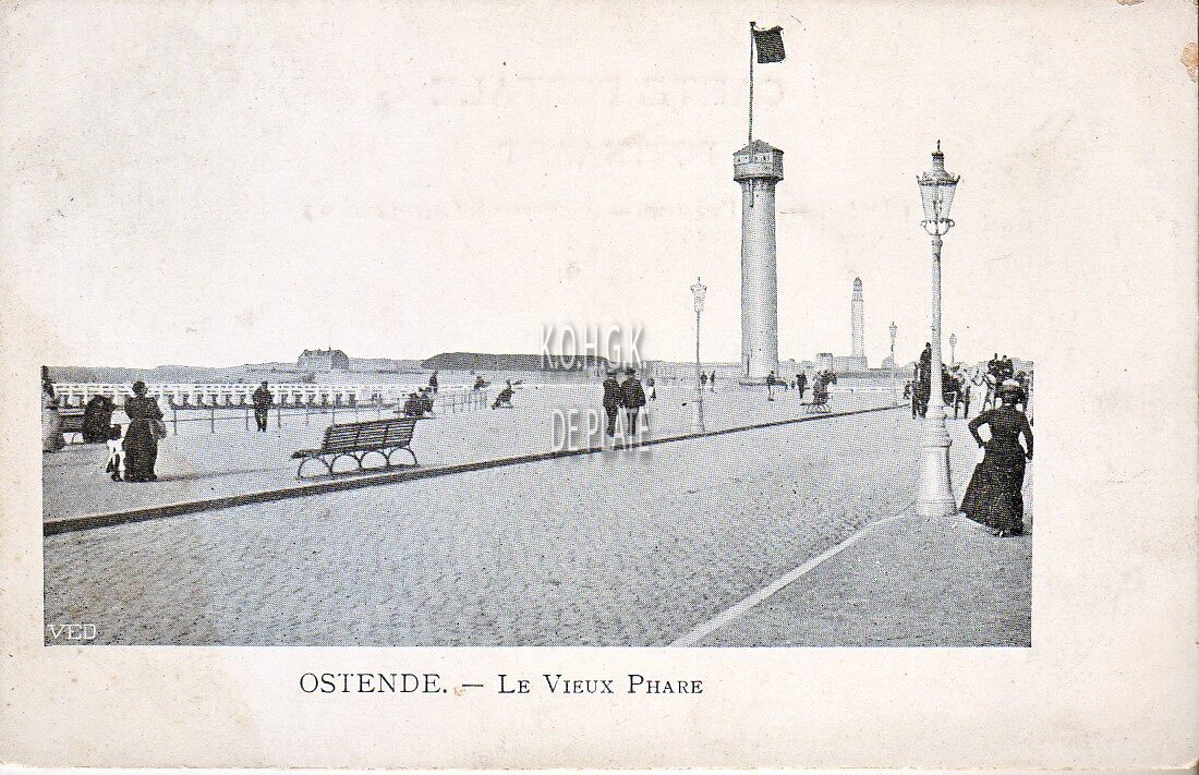 Ostende - Le vieux phare. - De eerste vuurtoren, genaamd "De Vlaggestok" langs de Zeedijk. Op de achtergrond, op de oosteroever, de tweede vuurtoren en links het militaire bouwewerk "De Halve Maan". Let op de mooie gaslantaarn. Oostende in de Belle Epoque.